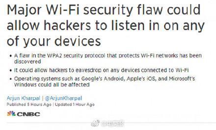 这个漏洞影响许多设备,比如计算机、手机、路由器,几乎每一款无线设备都有可能被攻击。