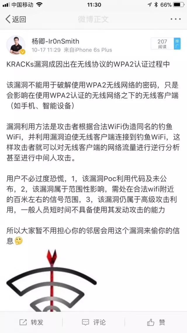 因为,Wi-Fi的安全漏洞源于安全标准本身,而非个体设备问题,但它会影响到连接到Wi-Fi网络的设备。